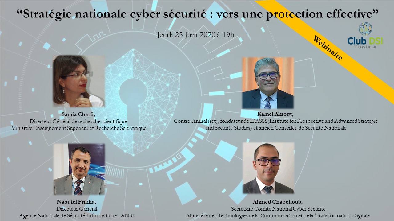 Le Club-DSI Tunisie organise le quatrième webinaire de la série de webinaires, ouverte au public, autour du thème de la transformation digitale de l'administration tunisienne: “Stratégie nationale cyber sécurité : vers une protection effective”, Jeudi 25 Juin 2020 de 19h à 20h30.